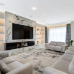 Family area: feature marble wall with tri phase MCZ wood-burner, recess for TV, clever strip lighting, bi-fold doors with electronic curtain rails