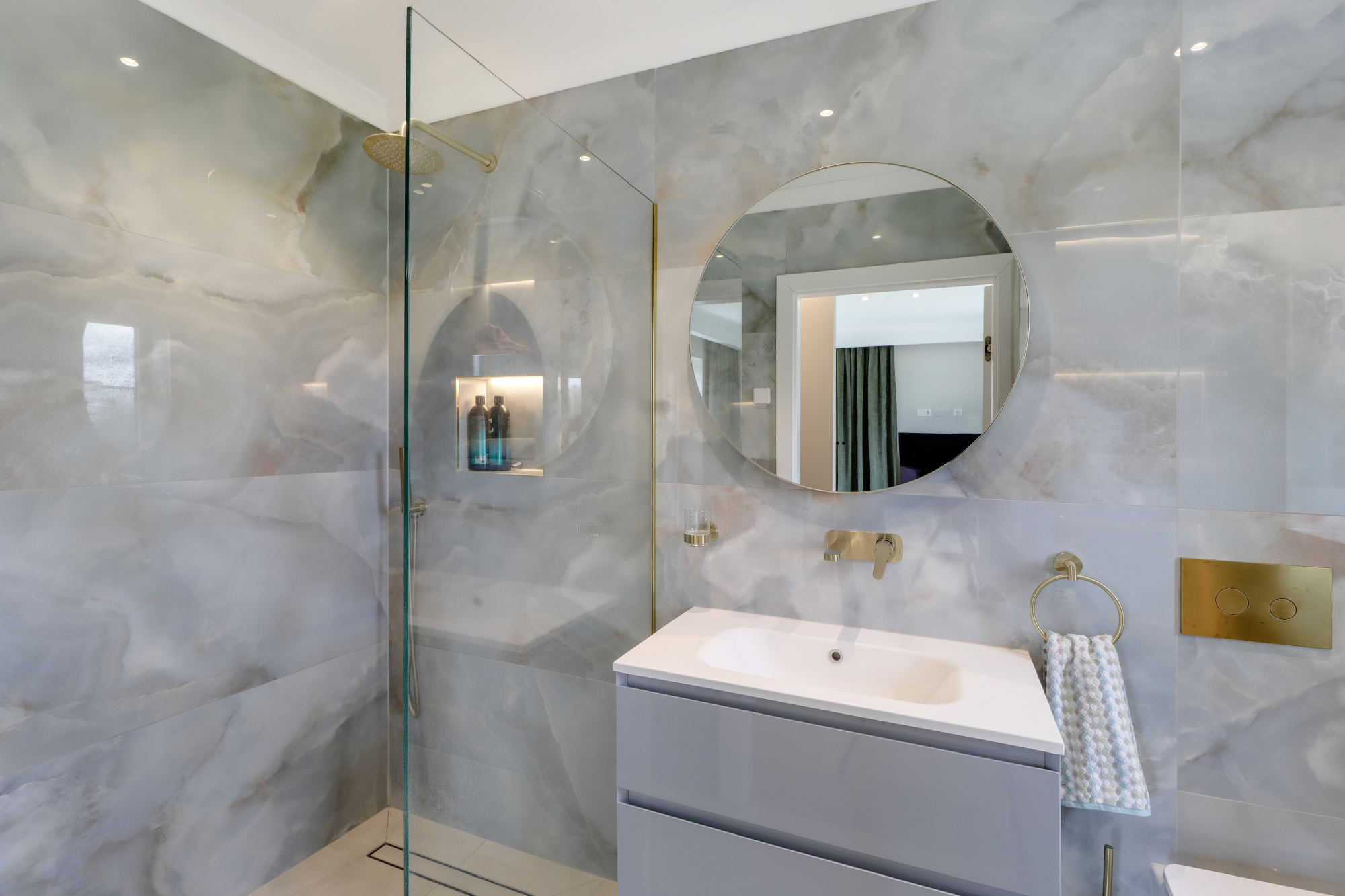 Family Bathroom: tub, hand basin set in vanity unit, separate shower unit, beautifully tiled with lighting in recess for display
