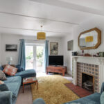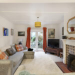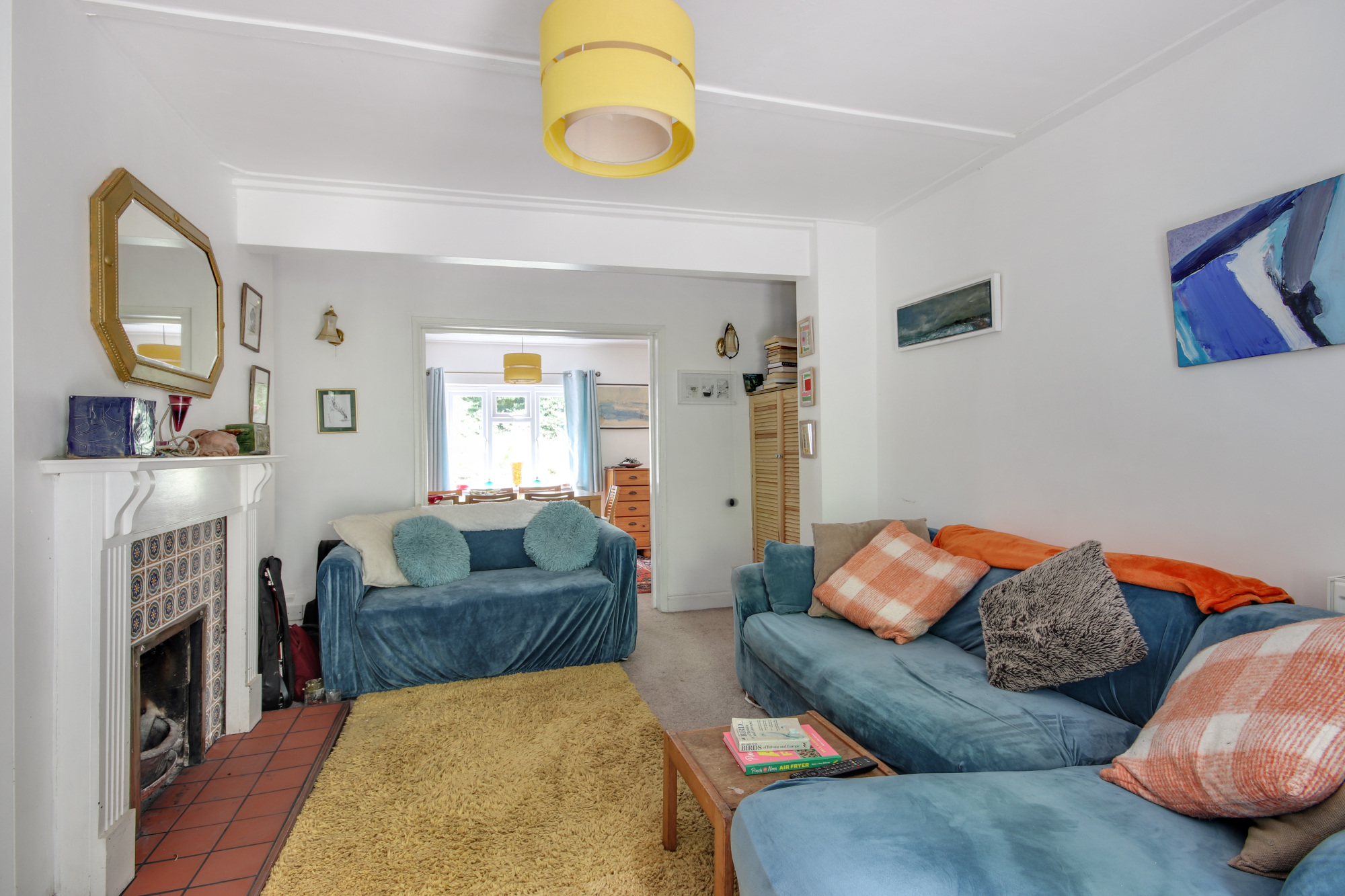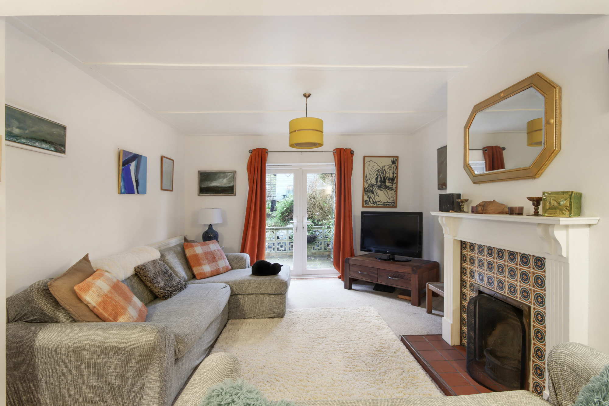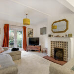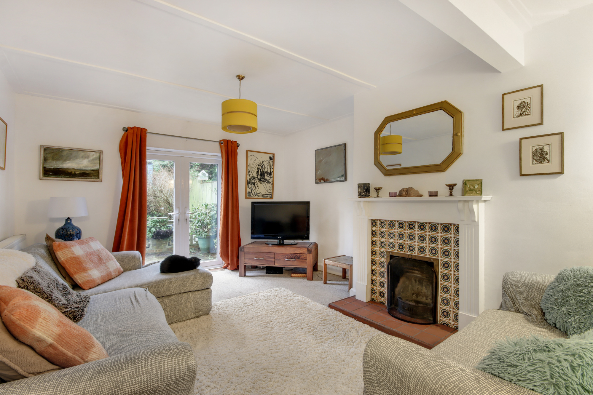 Sitting room, open feature fireplace with attractive surround, original panelled ceilings, French doors open on to the rear gardens.