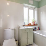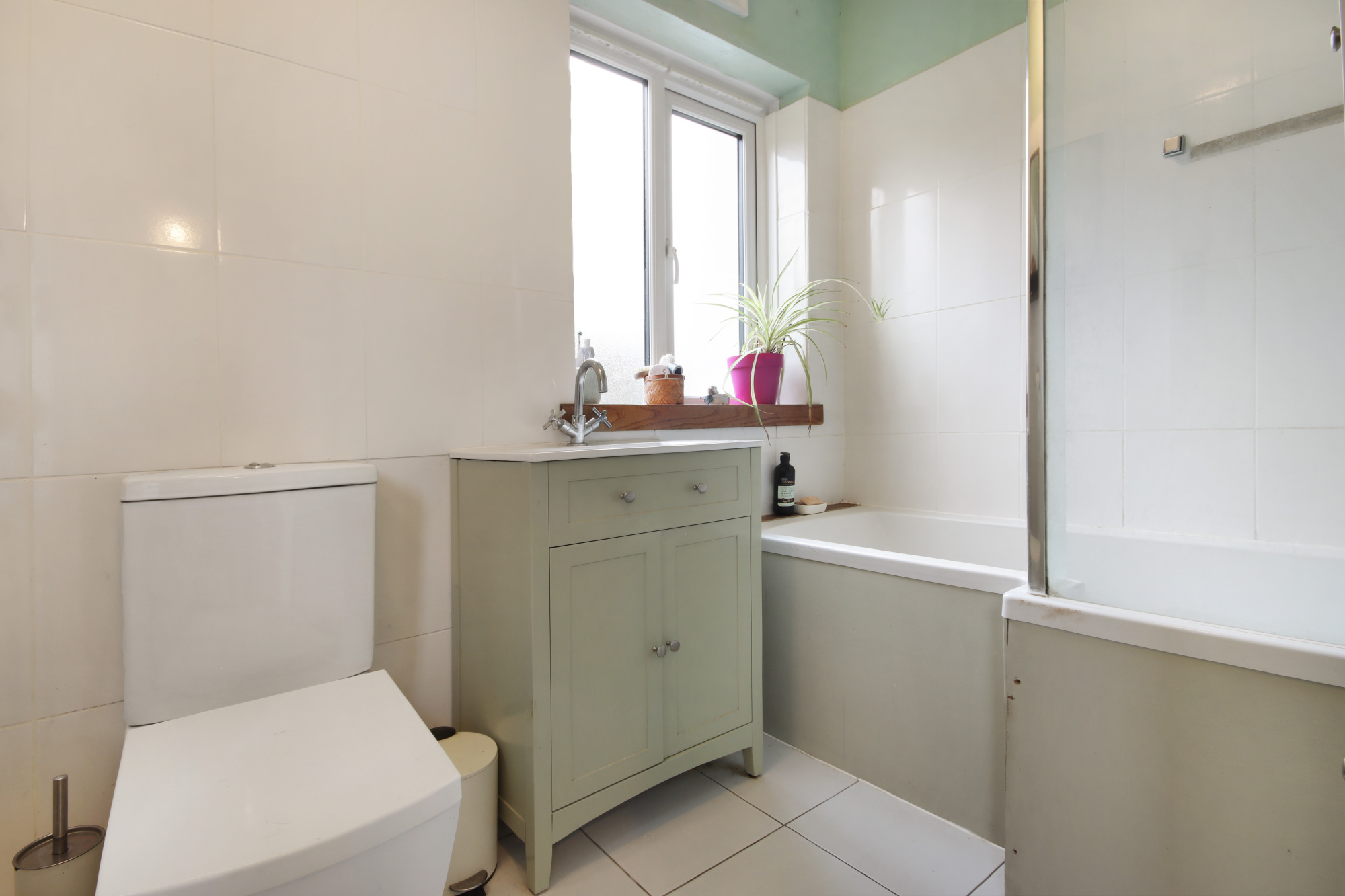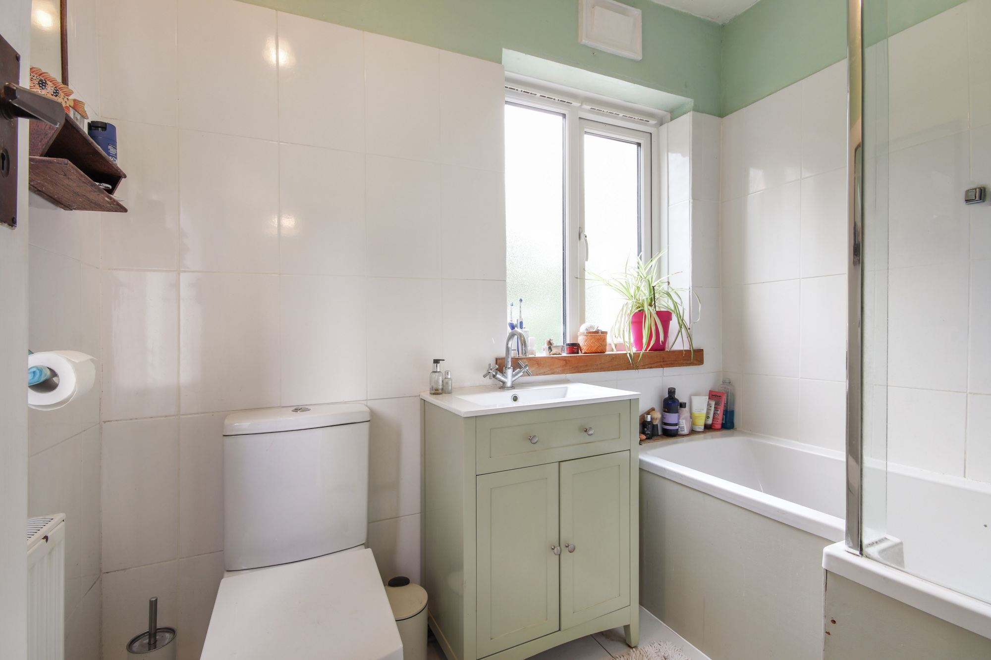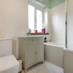 Family bathroom, white suite with shower over bath, hand basin in vanity unit, attractively tiled.