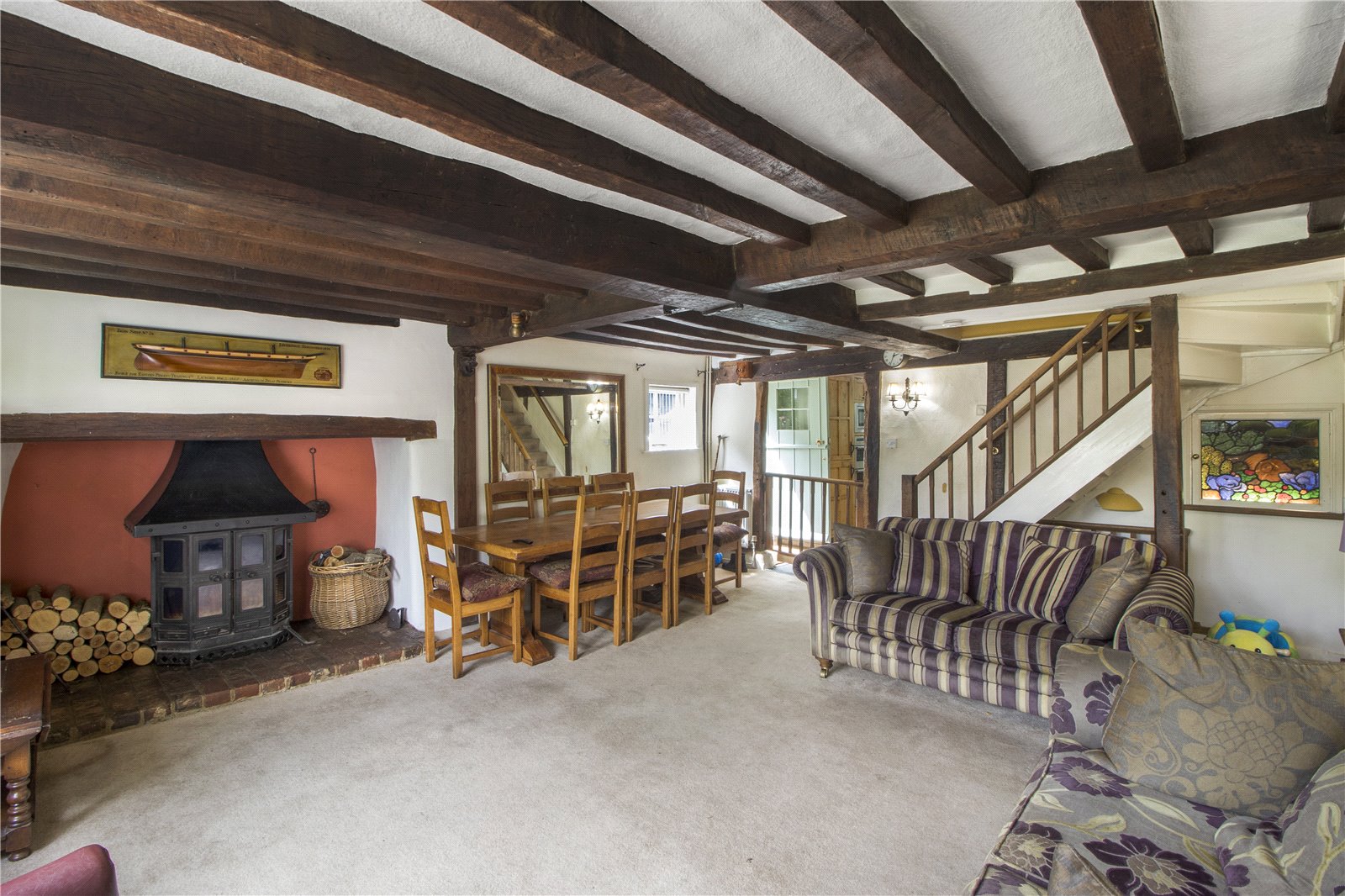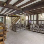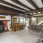 • Drawing Room, exposed beams to ceilings, inglenook fire place with bressummer, and wood burner, stairs to first floor and the original entry door, stained glass leaded window with lights.