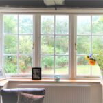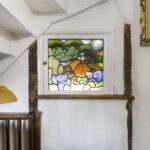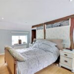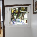 • Master bedroom, triple aspect with pretty panelled windows, wood flooring, exposed timber to wall with coloured glass leaded windows.