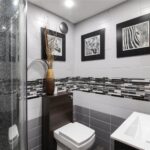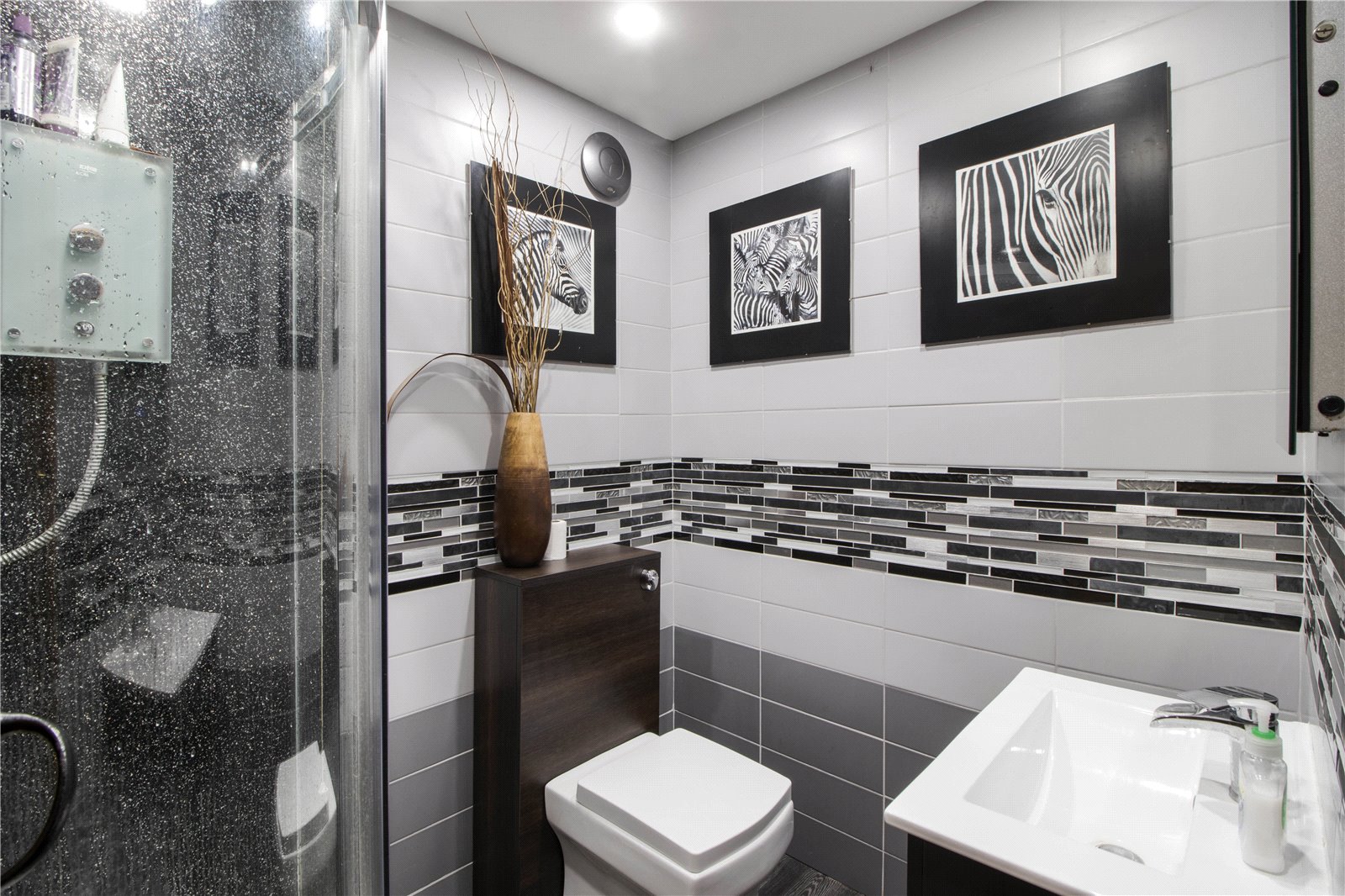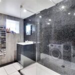 • Shower room, shower cubicle, WC, hand basin set in vanity unit, striking grey and white tilling.