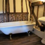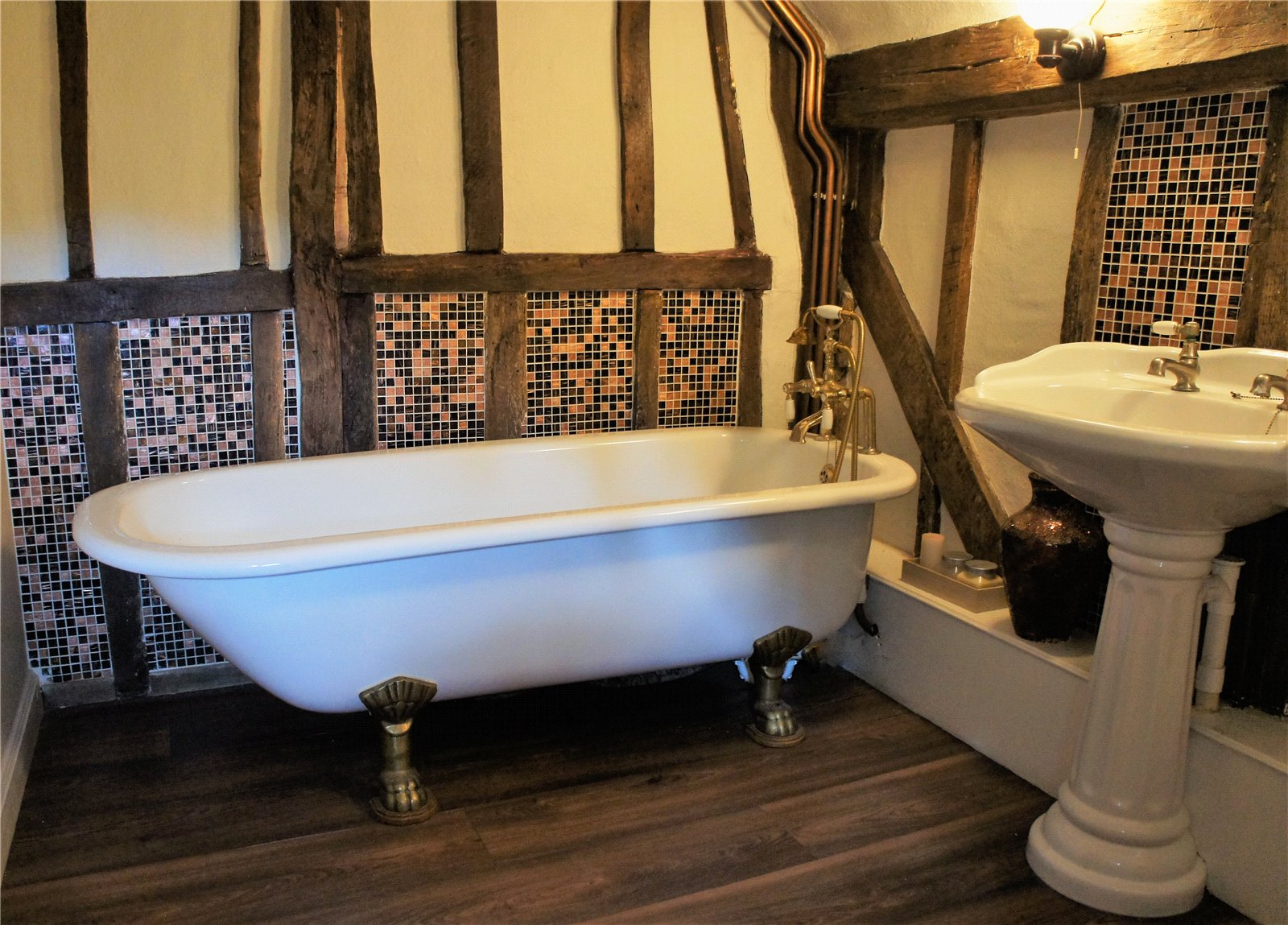• En-suite bathroom, rolled top bath on clawed feet, hand basin on pedestal, WC, attractive tilling and exposed timber to walls.